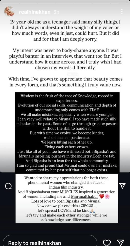 अभिनेत्री मृणाल ठाकुर हाल ही में सुर्खियों में आ गईं जब उनका एक पुराना इंटरव्यू सोशल मीडिया पर वायरल हो गया। इस वीडियो में 19 साल की मृणाल, बिपाशा बसु को ‘मस्क्युलर और मर्दाना’ कहती नज़र आईं और खुद को उनसे बेहतर बताया। क्लिप वायरल होते ही मृणाल को भारी ट्रोलिंग का सामना करना पड़ा। अब मृणाल ने अपने इस बयान पर माफी मांगी है, और इसी बीच हिना खान ने भी खुलकर उनका बचाव किया है।